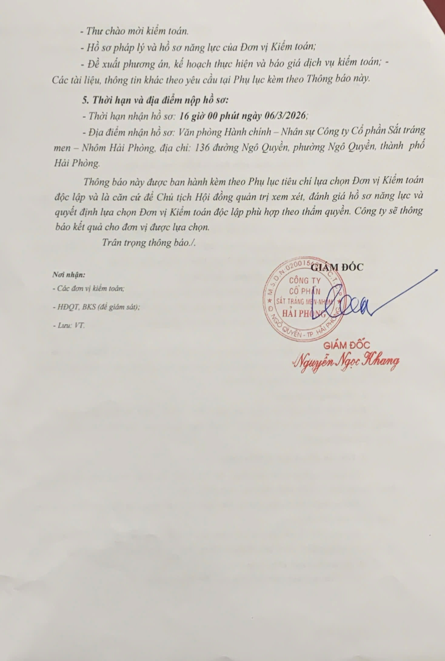 THÔNG BÁO VỀ VIỆC CHÀO MỜI ĐƠN VỊ KIỂM TOÁN ĐỘC LẬP